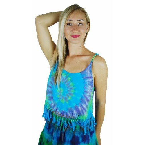 Rayon cropped fringe tie dyed vest top with spaghetti straps. One size fits chest up to 36" approx UK size 8-12 Available in Purple & multi, Teal and Cream, Blues, Black and multi. Every one is unique and will vary from the image